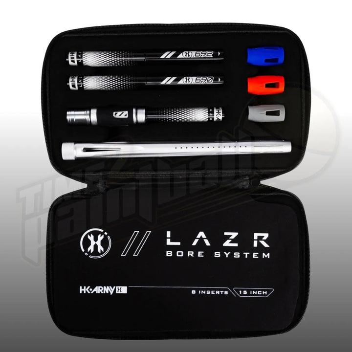 The LAZR Barrel Kit comes complete with 8 Barrel Bore Inserts, a Barrel Tip and 4 Interchangeable Accent Grips. The LAZR barrel is packaged in our custom HK Army Hard Shell Exo Barrel Case.