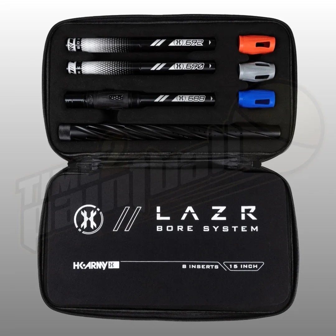 The LAZR Elite "Orbit" Barrel Kit comes complete with 8 Barrel Bore Inserts, an Elite Barrel Tip, Bore Sizer and 4 interchangeable Accent Grips. The LAZR Elite Barrel Kit is packaged with an HK Army EXO Barrel Protective Case.